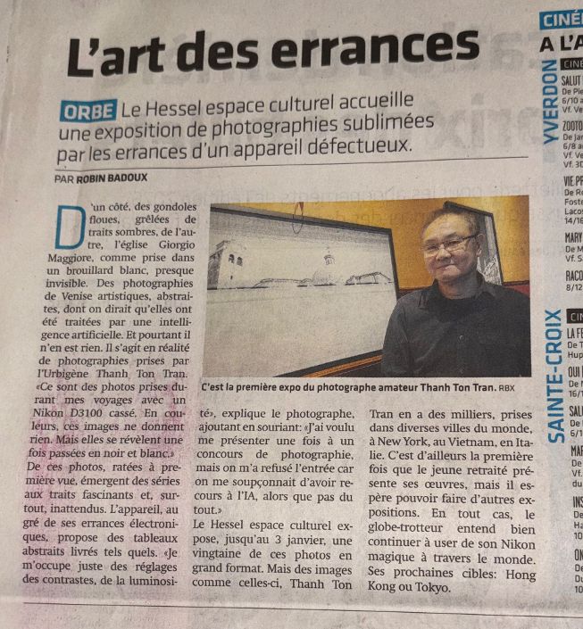 Un article du journal local met également en avant cette exposition, soulignant la singularité de ma démarche et la place centrale que j’accorde à la lumière comme matière.