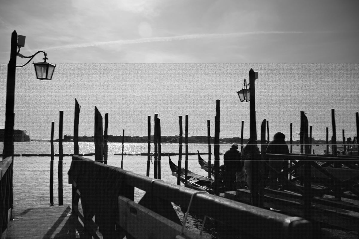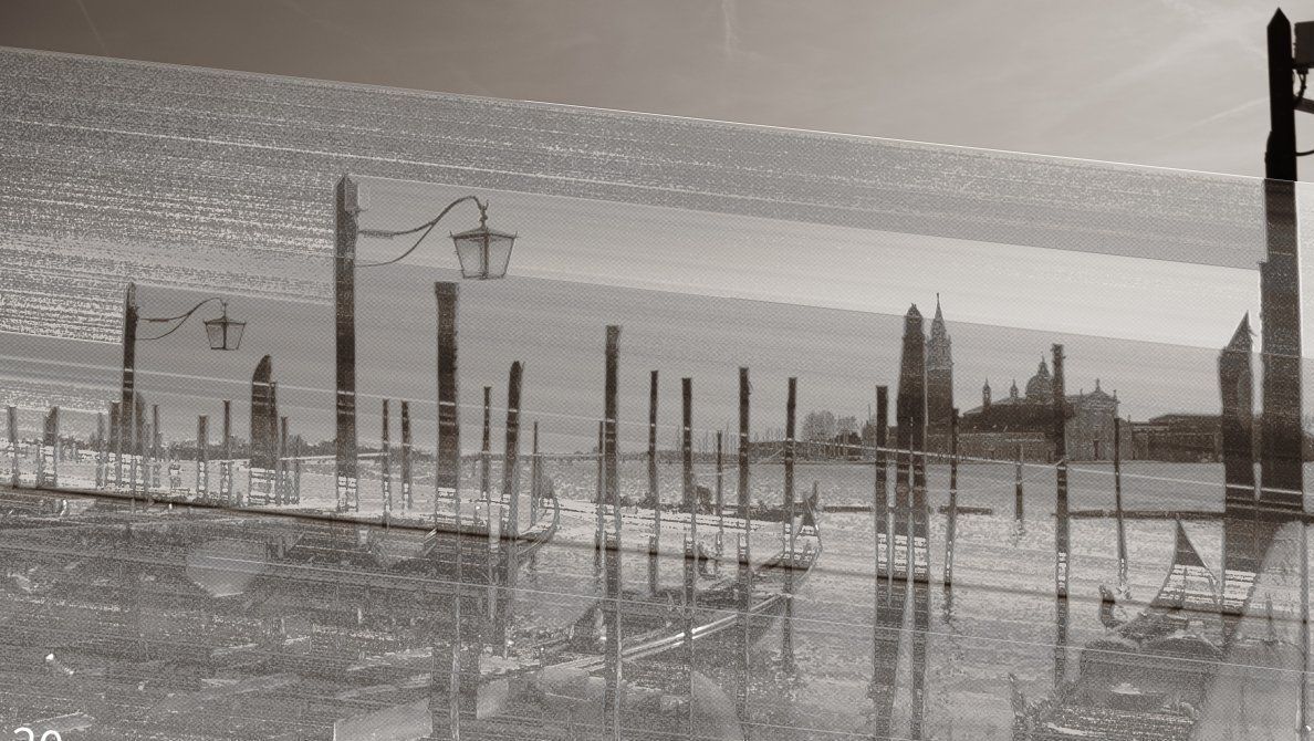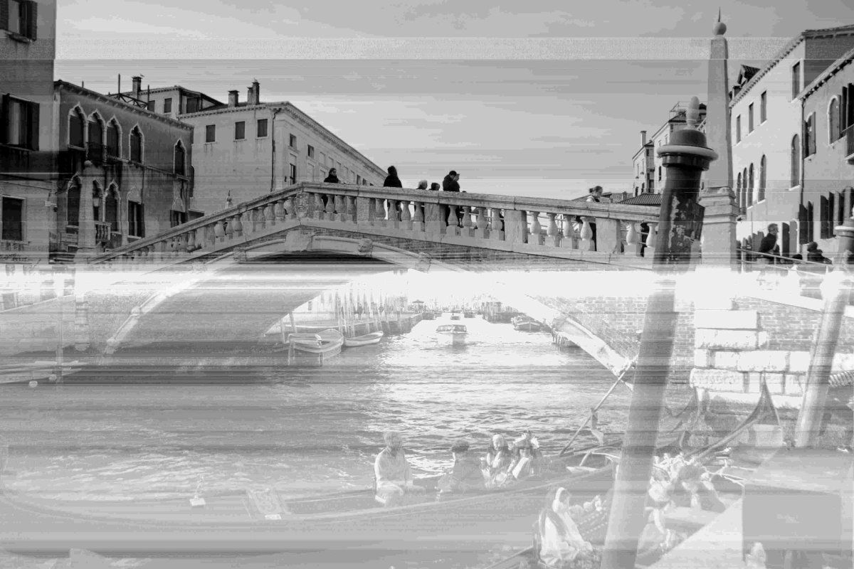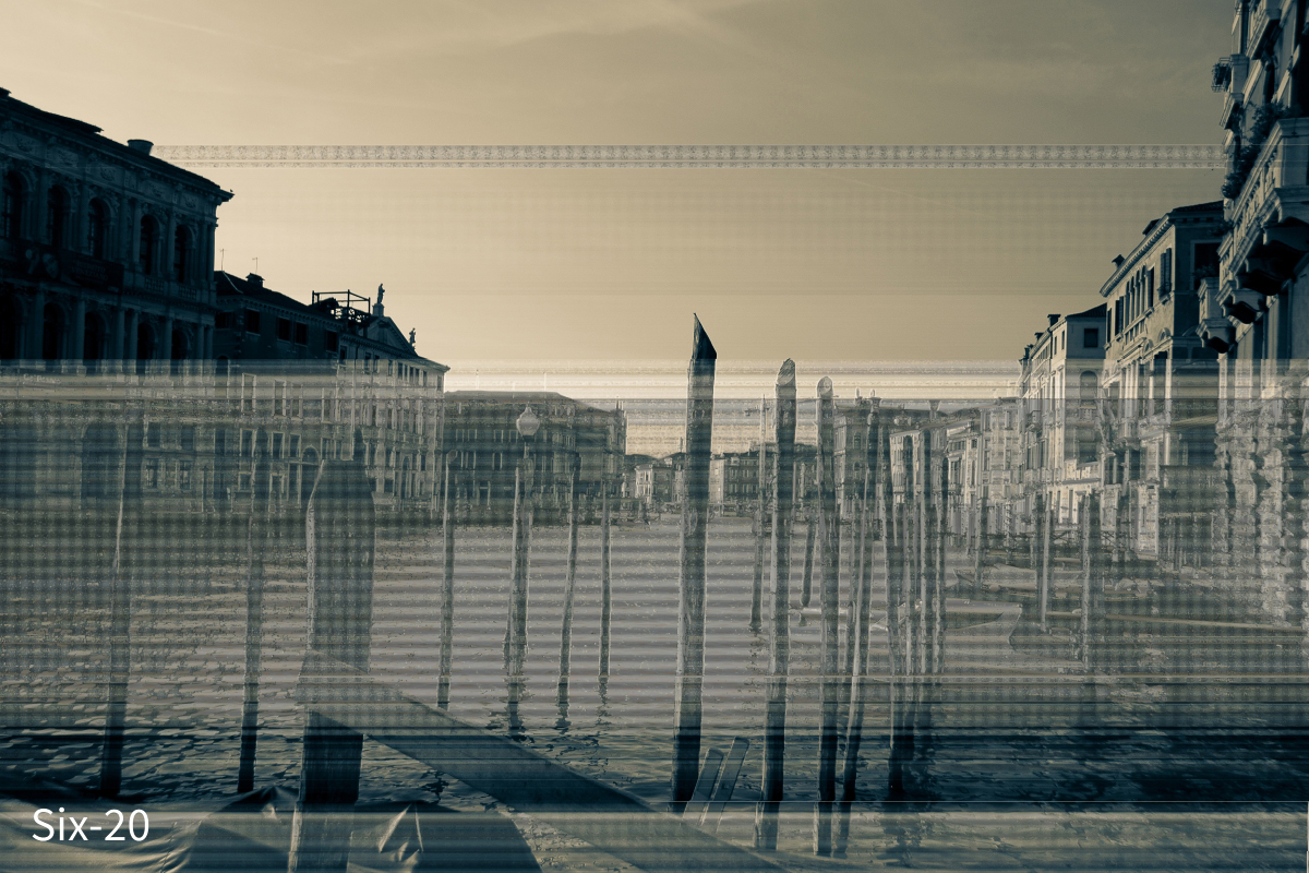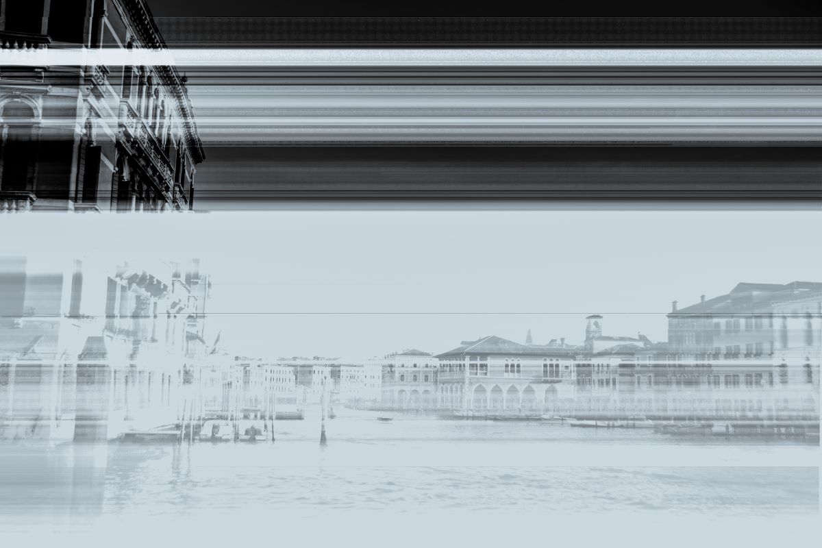 Ce qui fut solide devient spectre, réduit à quelques masses monumentales rayées d’interférences.